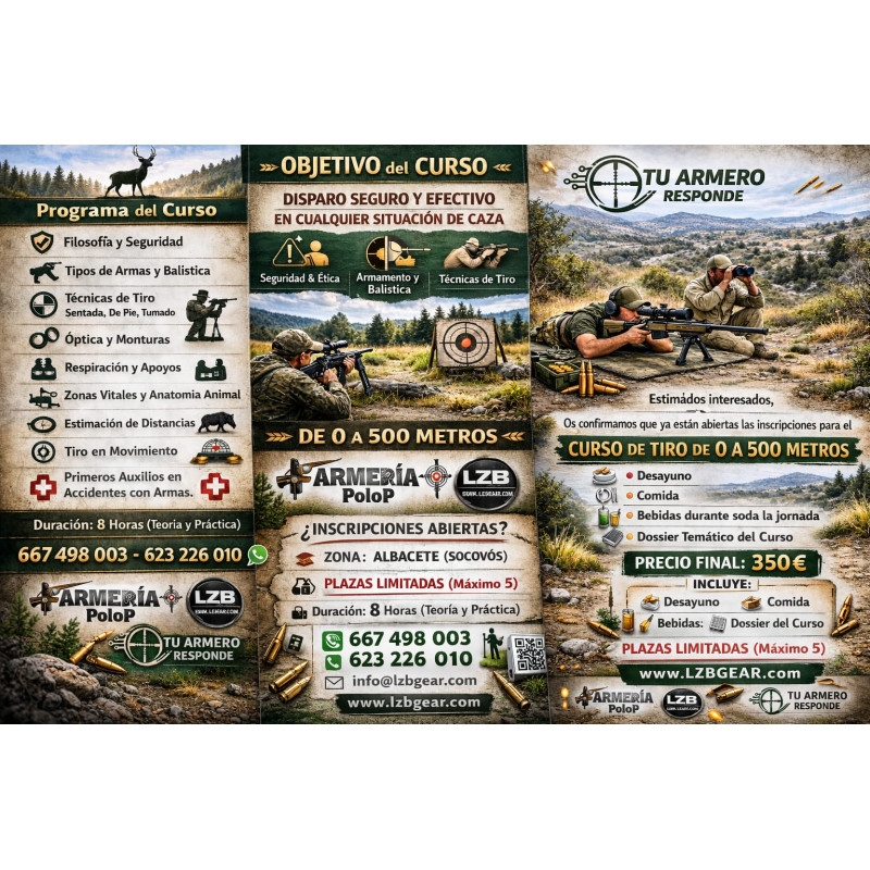 EL IMPORTE TOTAL DEL CURSO ES DE 350€, a traves de esta reserva se realizara el pago de 100€ del total de 350€, quedando pendiente 250€, que se abonaran a mitad de curso, el curso es 90% teorico y el 10% practico( correccion de postura de tiro, centrado de tu propio visor) aprende del porque te estan pasando esos errores y fallos que no entiendes, aprende balistica, optica y encuentra luz a todas esas sombras que tienes en tus dias de caza. para mas info: 667498003,JOSE GABRIEL.
